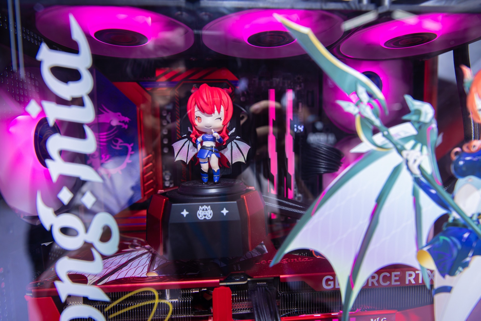 水冷头上摆放的魔龙姬Q版手办,1号机采用经典黑红撞色,