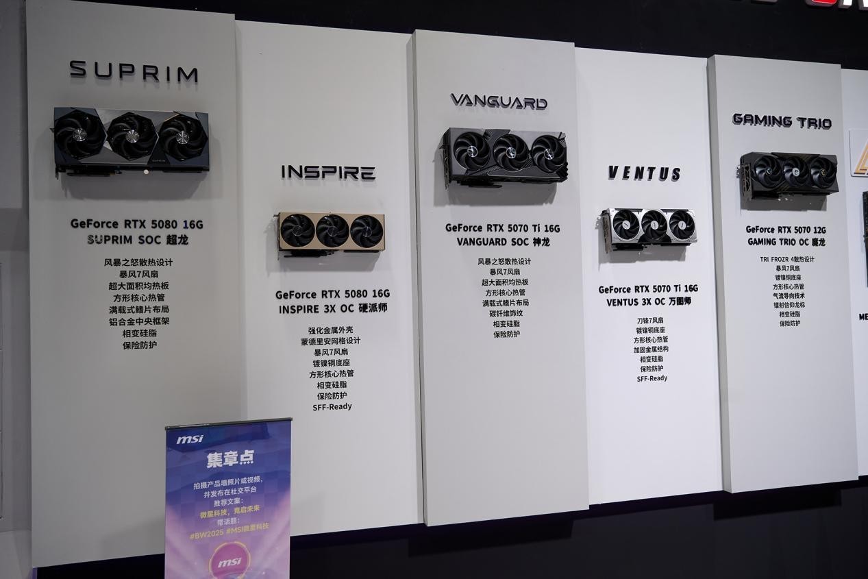 此次BW2025,产品墙汇聚了新一代 GeForce RTX 50系列显卡,创新采用金属蚀刻工艺精雕魔龙姬形象。RTX 5070 Ti VANGUARD SOC神龙/VENTUS 3X OC万图师以及RTX 5070 GAMING OC魔龙等。全家桶惊艳亮相